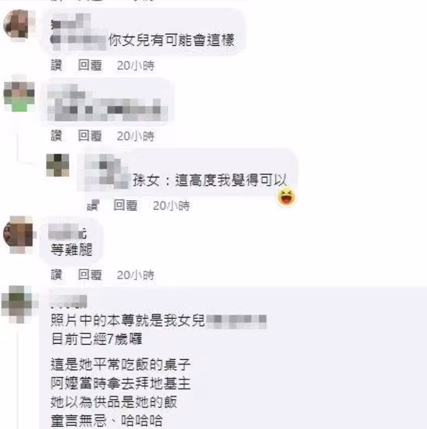 留言中也意外釣出女童的母親表示,「照片中的本尊就是我女兒,目前已經7歲囉,這是她平常吃飯的桌子,阿嬤當時拿去拜地基主,她以為供品是她的飯,童言無忌、哈哈哈。