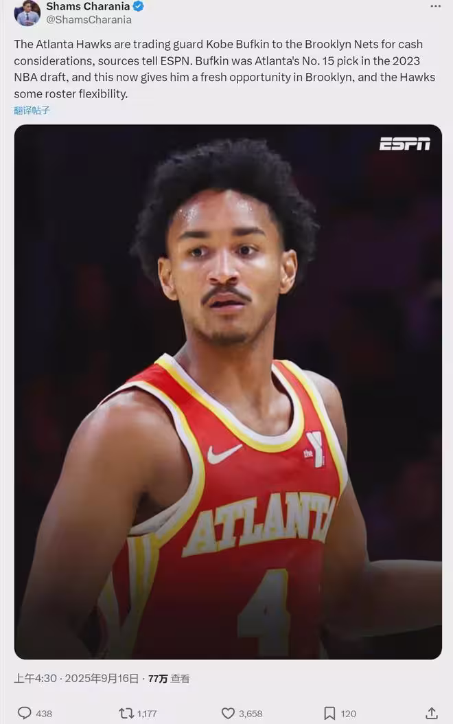 我們一個個新聞來說,科比-巴夫金是2023年的首輪15號秀,老鷹剛剛培養兩年,為啥把他送給籃網?其實老鷹是為了騰出空間,明年夏天續約丹尼爾斯和波爾津吉斯。籃網用空間直接吃下科比-巴夫金的合同,白撿了一個首輪秀。