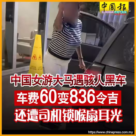 中國女游大馬遇駭人黑車 車費60變836令吉 還遭司機鎖喉扇耳光