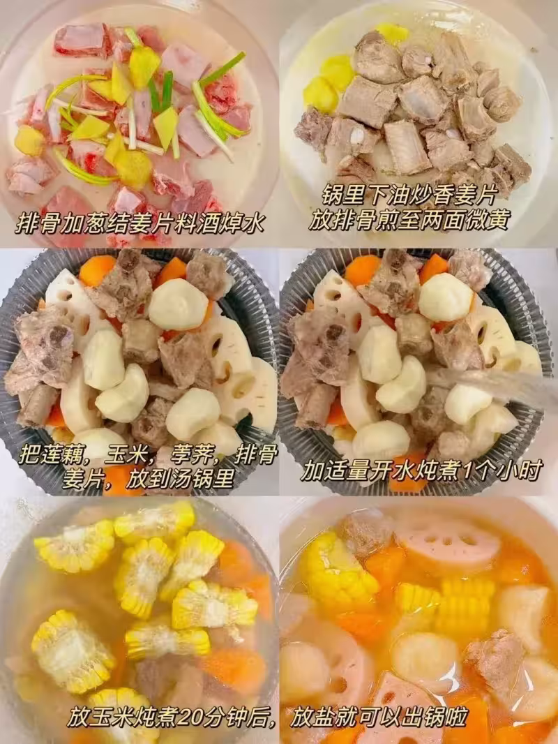 1.排骨加蔥結、薑片、料酒焯水,去血沫和腥味; 2.鍋中倒油,炒香薑片,放入焯好的排骨煎至兩面微黃; 3.將蓮藕、馬蹄、玉米、胡蘿蔔、排骨、薑片放入湯鍋; 4.加適量開水,燉煮 1 小時,最後放鹽調味即可。