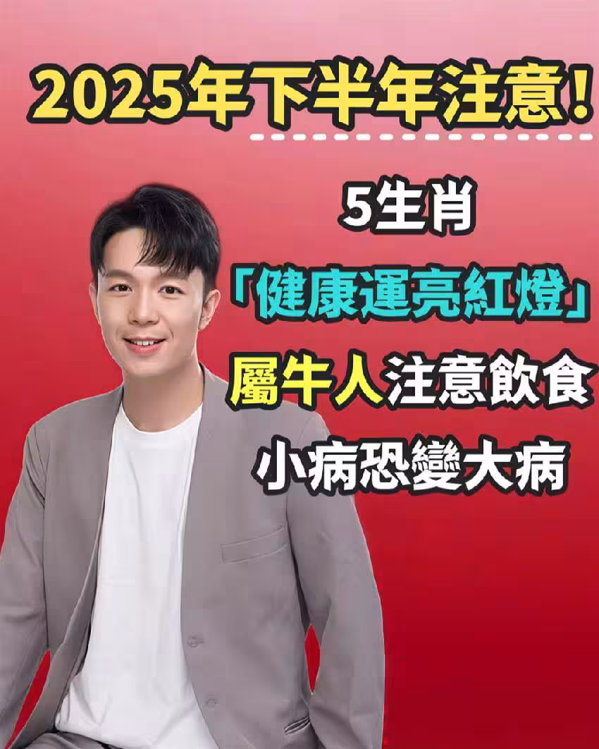 對此,《TVBS新聞網》報導指出,近期命理專家湯鎮瑋老師分析2025下半年的健康運勢,特別點名出5個生肖需要格外留意,快跟小編一起來看看: