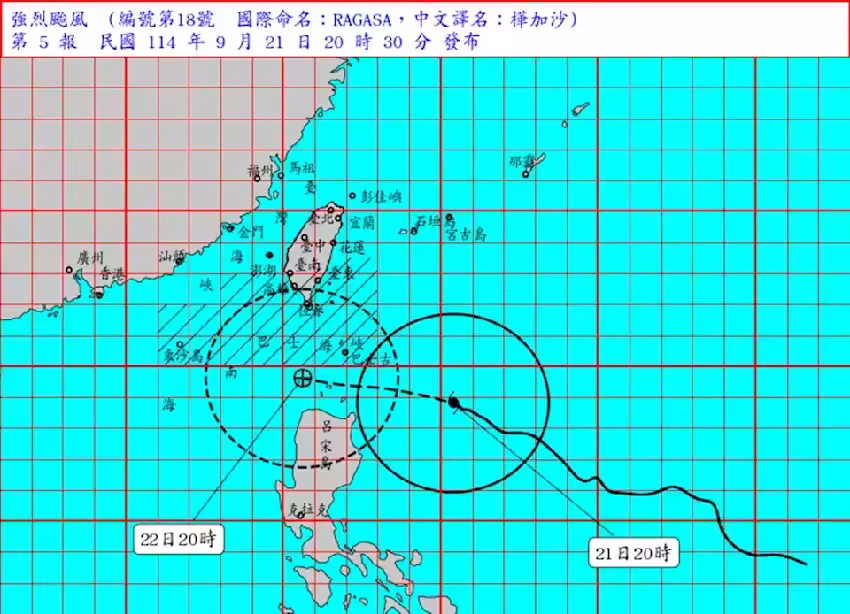 樺加沙今天上午已增強為強台,明天、23日對台影響明顯;中央氣象署晚間8時30分持續發布陸上颱風警報,陸上警戒範圍為台東、恆春半島及屏東地區,海上警戒範圍則為台灣海峽南部、台灣東南部海面、巴士海峽、東沙島海面。