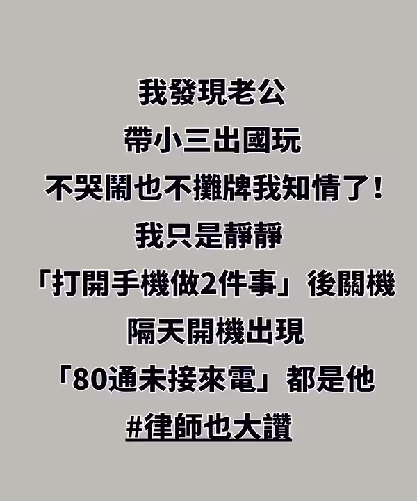 前陣子聽做律師的朋友陳姐說起一個案例,35歲的林小姐發現老公帶小三出國旅遊後,沒有哭鬧也沒有質問,而是冷靜地提前「處理信用卡和帳戶」 第二天早上,林小姐開機後,看到老公一夜之間打了80通未接來電,還有幾十條催她解鎖支付的訊息,她只淡淡回復了一句「我們談談離婚吧」,利落又清醒的處理方式,讓不少人佩服「這才是被背叛後該有的樣子,不委屈自己,不縱容錯誤」 接下來,就來看看她具體做了什麼吧!