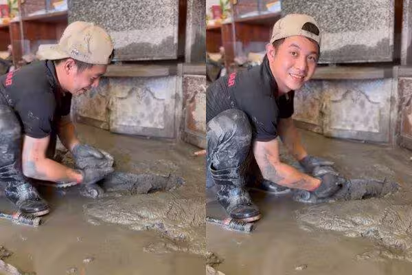 片中的男子靈機一動,先用高壓水槍將泥漿沖軟,這些泥巴就會像「豆腐一樣」鬆軟,接著徒手抓起大片安裝,再用腳輕輕一踢就搞定了,清理起來省時又省力。