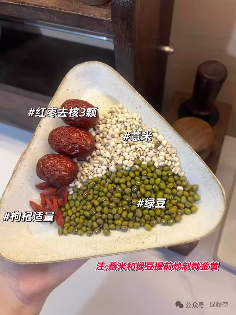 1. 先處理綠豆和薏米:不加油,直接把綠豆和薏米倒進無油鍋中小火翻炒。全程要不停翻動,別炒糊了,等看到薏米表面微微發黃,能聞到淡淡的穀物香,就可以關火盛出來,放涼備用。這一步能去掉食材的寒涼之氣,喝著更溫和。