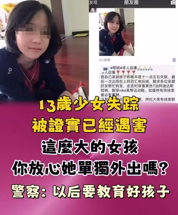 13歲少女失蹤被證實已經遇害,這麼大的女孩你放心她單獨外出嗎?警察:以後要教育好孩子。
