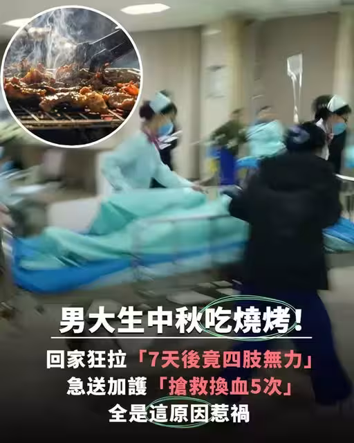 中秋吃燒烤!男大生回家狂拉「7天後竟四肢無力」急送加護「搶救換血5次」全是這原因惹禍。