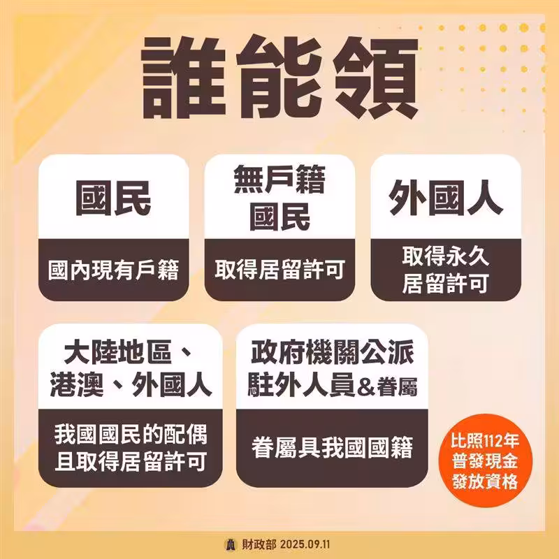 財政部指出,1萬元發放的對象比照之前普發現金的制度,領取資格包含: