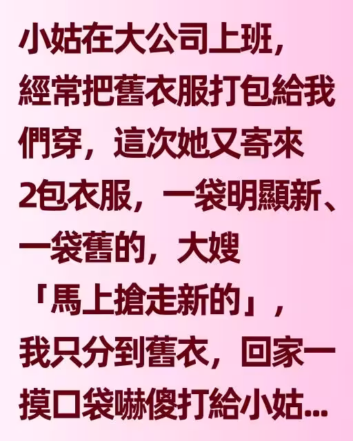 小姑在大公司上班,經常把舊衣服打包給我們穿,這次她又寄來2包衣服,一袋明顯新的、一袋舊的,大嫂「馬上搶走新的」,我只分到舊衣,回家一摸口袋嚇傻打給小姑!