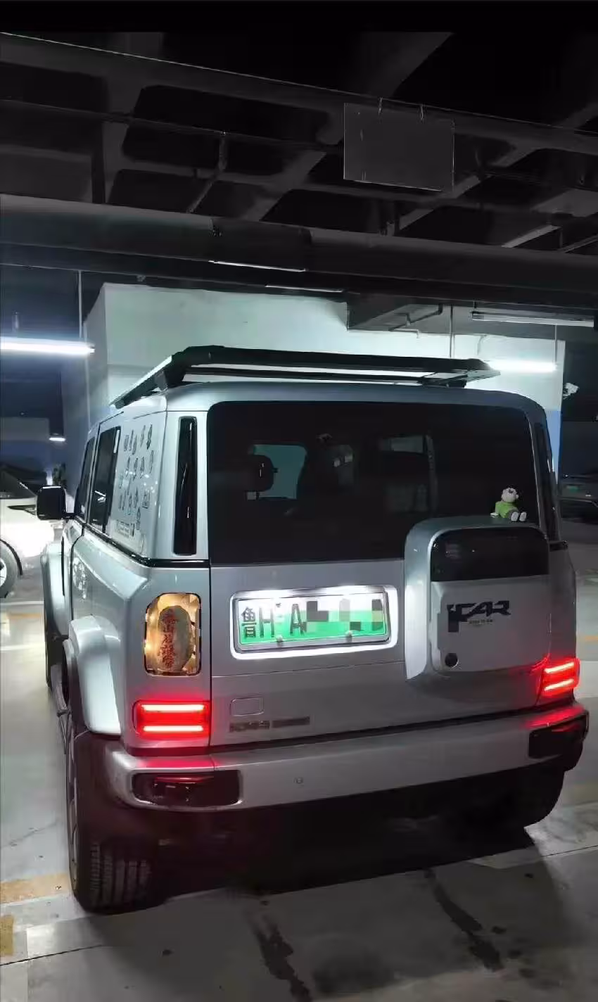 這塊石頭被巧妙地安置在車輛的尾燈之間,上面刻著一些字跡,雖然在行駛中可能難以辨認,但這種裝飾無疑為車輛增添了一份獨特的個性。
