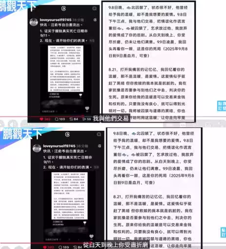 大部分網友認為,汪俞岑所寫的內容與於朦朧生前最後階段事件時間相呼應。(圖/翻攝自鵬觀天下YT)