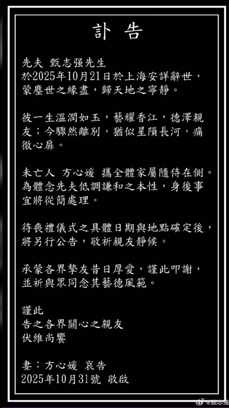 於2025年10月21日於上海安詳辭世,蒙塵世之緣盡,歸天地之寧靜。