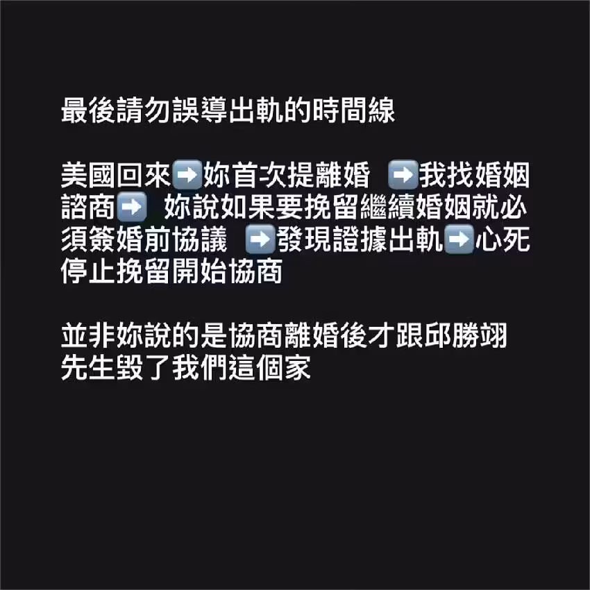 最後他也呼籲女方勿誤導出軌時間線,表示從美國回來後女方首次提離婚,自己尋求婚姻咨商,女方則說若要挽留婚姻,必須簽婚前協議。