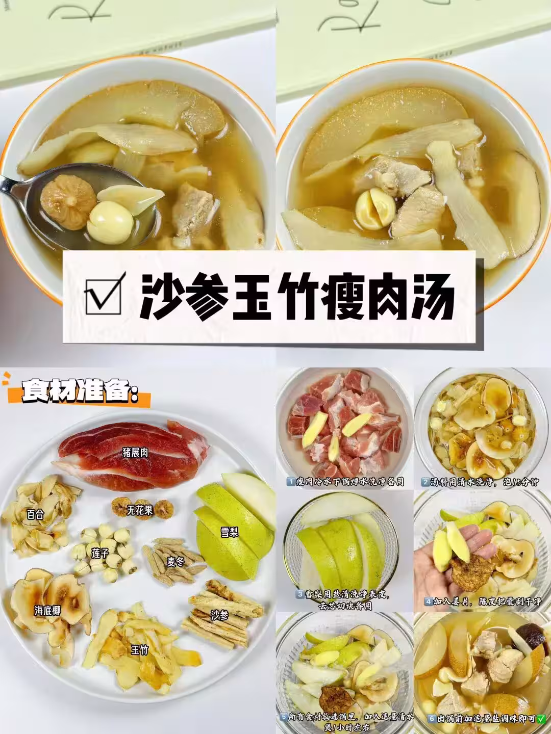 食材準備: 豬展肉、百合 無花果、雪梨 蓮子、麥冬 海底椰、沙參、玉竹 製作步驟: 瘦肉冷水下鍋焯水洗凈備用 湯料用清水洗凈,泡15分鐘 雪梨用鹽清洗凈表皮 去芯切塊備用 加入薑片,陳皮把囊刮乾淨 所有食材放進鍋里,加入適量清水 煲1小時左右 出鍋前加造量鹽調味即可☑ ✅六、牛腩白蘿蔔湯