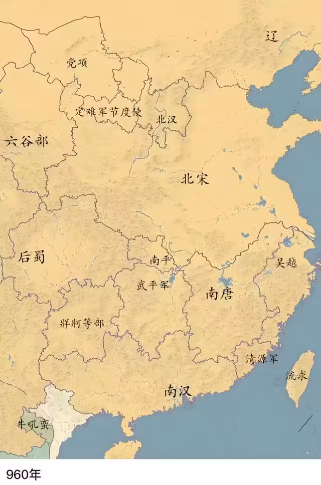 但是,在這10年時間裡,趙匡胤和他的大宋王朝可沒閒著。趙匡胤先是在公元967年出兵滅掉盤踞湖南、湖北的南平國,而後又在公元965年滅掉了四川的後蜀國;再之後又在公元971年滅掉了盤踞兩廣之地的南漢政權。