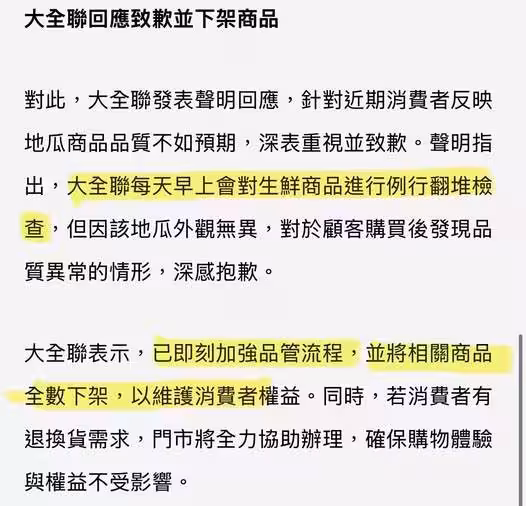高嘉瑜除了公開投訴,還呼籲政府部門出面監督,要求加強品管並設立有效客服管道,保障消費者權益。「希望主管機關可以協助,讓民眾遇到品質異常能順利退換貨,而企業必須正視品管問題,別讓消費者吃虧。」貼文曝光後引發大批網友共鳴,許多留言反映近日在大全聯或其他量販店購買蔬果遇到品質不佳、價格持續上漲,且商品瑕疵投訴困難。