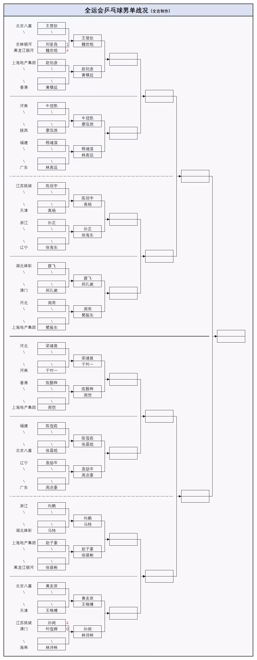 在本屆全運會前兩天的較量中,成年組單打首輪只有4場對決,現已全部結束,其中男子選手魏世皓、孫聞與女運動員劉煒珊、范思琦獲得晉級,接下來將分別迎戰王楚欽、林詩棟、孫穎莎、王曼昱,而單打32強的完整對陣安排也已經出爐,詳情如下: