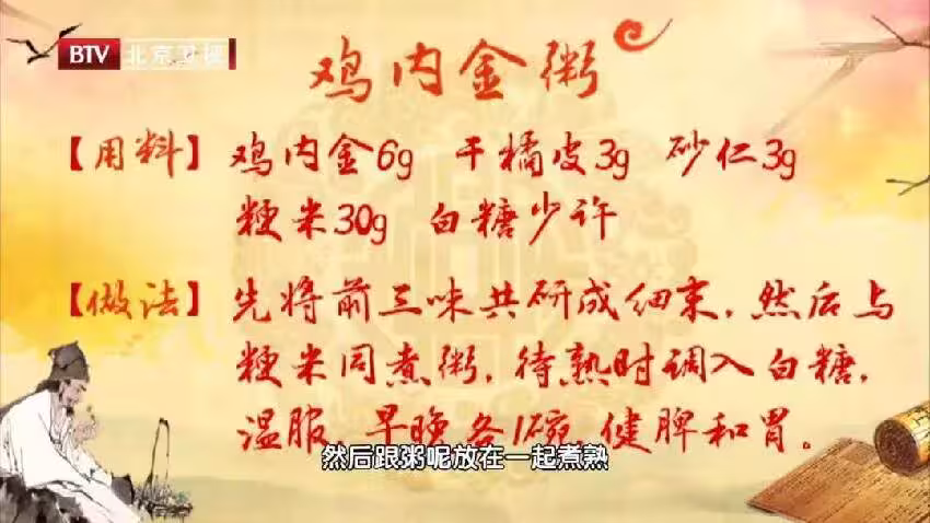 【食材】雞內金6克、干橘皮3克、砂仁3克、粳米30克、白糖少許。