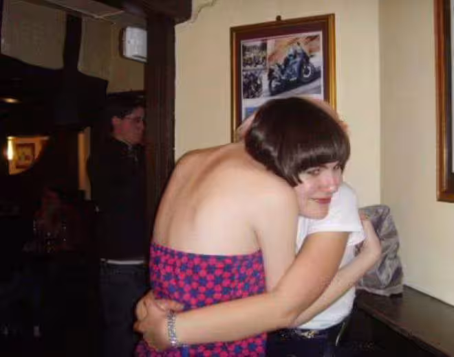 一個黑色短髮女孩的頭像是憑空出現在兩人中間,又想兩人中任意一個人的頭。