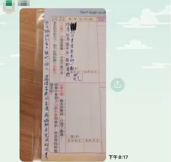 只見畫面中是老師在聯絡簿上提醒家長,由於孩子的作業幾乎都不會寫,常常需要老師一對一指導,但老師實在無法只顧一個學生,因此希望孩子回家後,家長能協助完成作業。