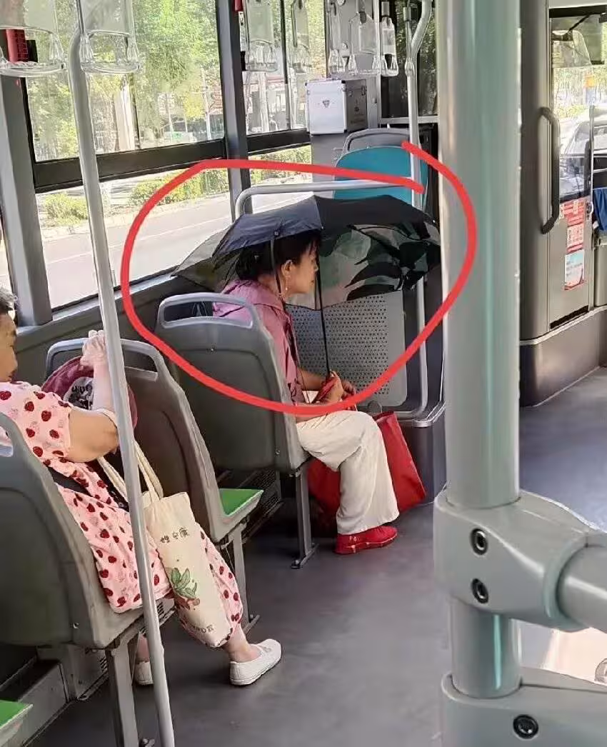 唯獨車廂中部空出一圈詭異空間——一位穿著長袖長褲的女士,在室內高舉著一把厚重的黑色遮陽傘。