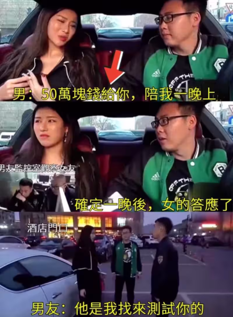 影片中,男友安排朋友在車上放置50萬現金,以「陪伴一晚」為條件測試女友忠誠度。起初女友多次拒絕,表示「我不是這樣的人」,還強調自己有男朋友。但在對方持續以「這筆錢能改變生活」勸說下,她最終動搖答應,還打電話向男友謊稱要加班。當男友突然現身揭穿測試時,兩人當街爆發激烈爭吵,女友哭訴:「我等你多久了?我們在一起幾年了?你買房子了嗎?」