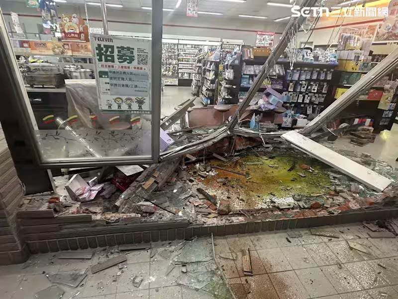 奔馳撞進超商,造成落地窗碎裂,貨物破損,現場滿目瘡痍。