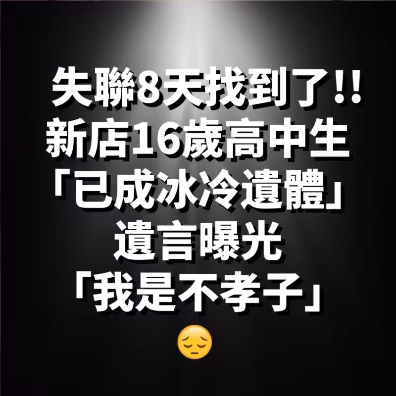 失聯8天找到了!新店16歲高中生「已成冰冷遺體」 遺言曝光「我是不孝子」