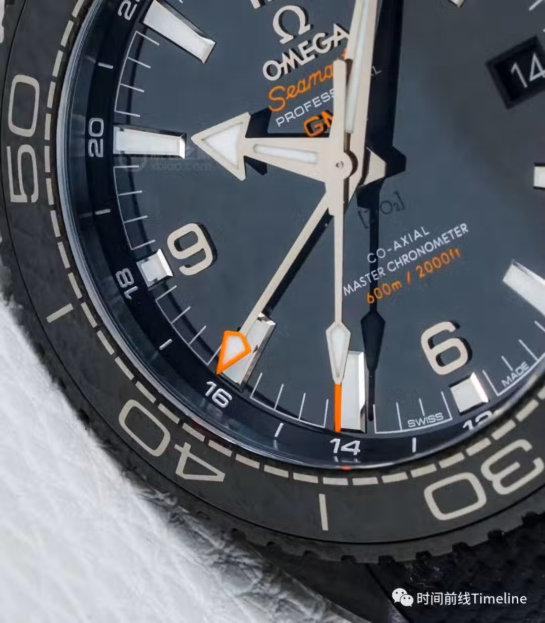 陶瓷圈上的潛水刻度,填充液態金屬。液態金屬刻度,是斯沃琪集團的獨有技術,除了歐米茄深海之黑外,也使用在寶珀50噚深潛器的陶瓷圈上。