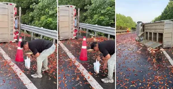 貨車在高速公路上翻車,車廂內貨物「全灑落行車道」,路人細看後驚恐:竟都是活物!