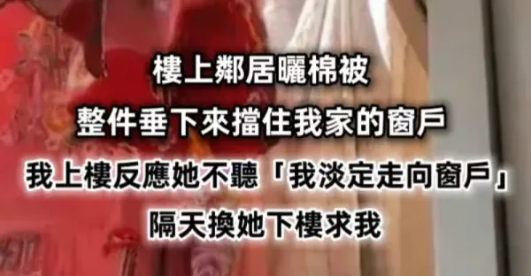 樓上鄰居曬棉被「整件垂下來擋住我家的窗戶」!我上樓反應她不聽「我淡定走向窗戶...」隔天換她下樓求我