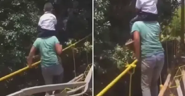 她抱兒坐肩上走獨木橋,媽「腳滑踩空」男童下秒慘墜溪谷:實時影片瘋傳