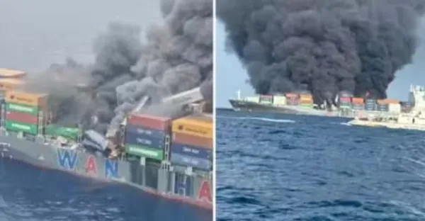 快訊/萬海貨輪大爆炸!近50個貨櫃炸飛入海「2台灣人失蹤...」濃煙沖天危急情況曝