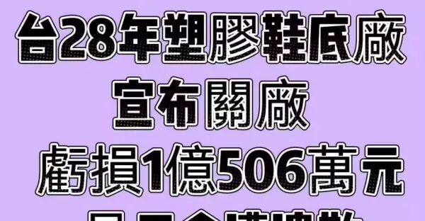 快訊/台28年塑膠鞋底廠宣布關廠! 虧損1億506萬元 員工全遭遣散!