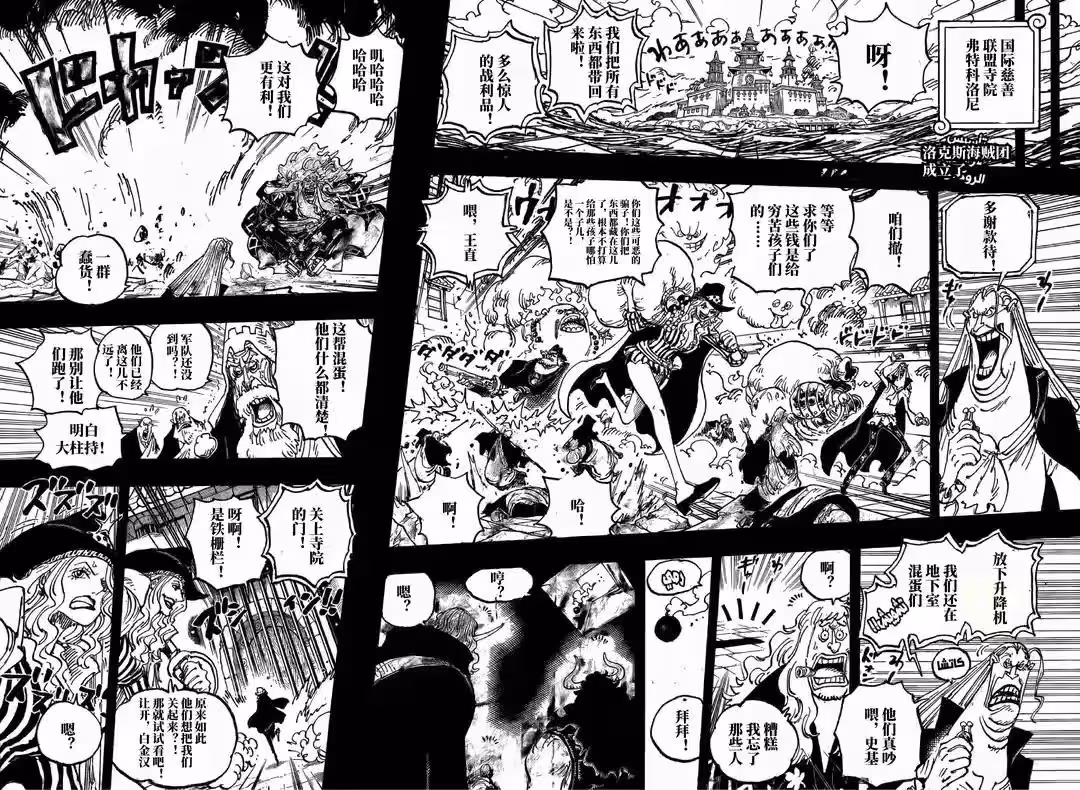 洛克斯海賊團再次搶奪財寶,他們盯上了國際慈善寺廟的財寶,這裡的財寶非常多,大媽和其他人正在大包小包搶奪財寶。他們剛想離開,金獅子就丟下一個炮彈,把通道堵死了,大媽等人也被巨大的鐵門攔住去路。