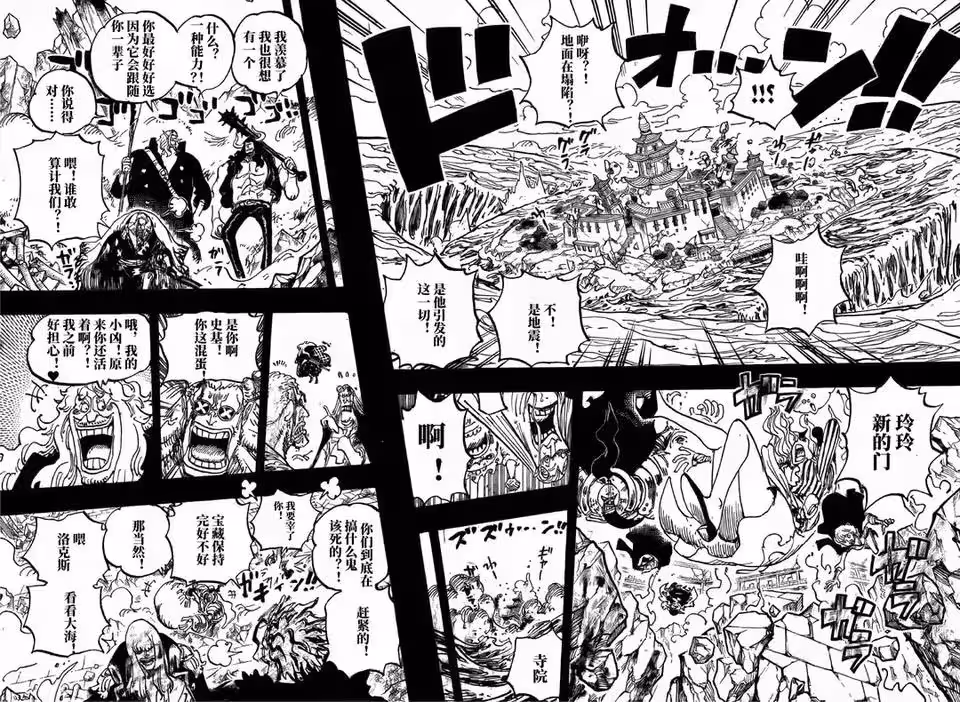 白鬍子使用了震震果實能力,整個島嶼發生了地震,大媽直接掉下來,眾人也逃出去了。凱多非常佩服白鬍子的能力,他也想獲得惡魔果實能力,不過白鬍子告訴凱多,你要好好選擇惡魔果實能力,金獅子和銀斧差點打起來了。