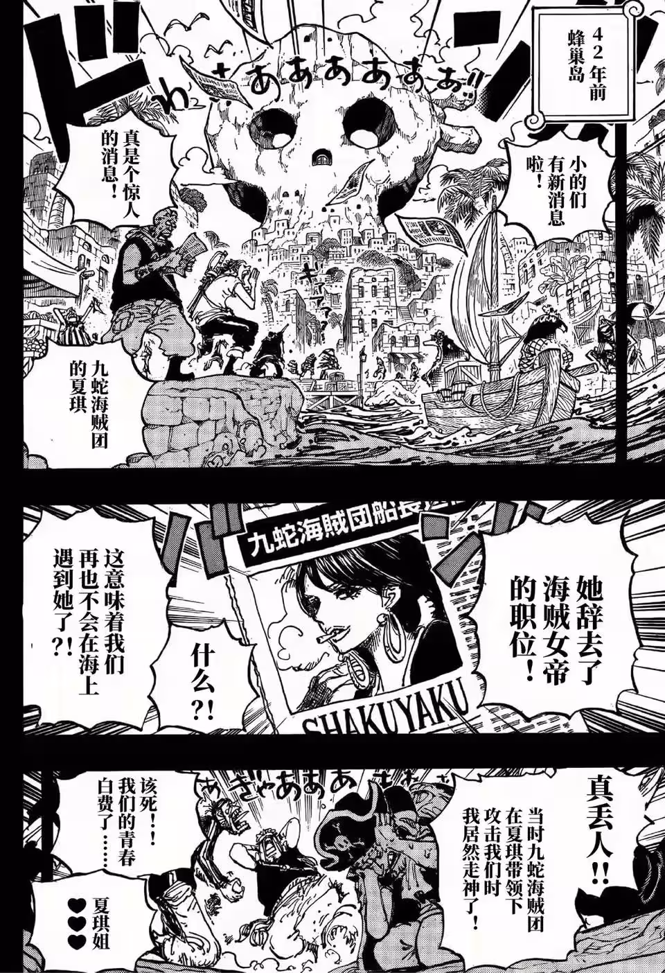 42年前的蜂巢島,夏琪已經退出九蛇海賊團,這件事引發了不少爭議,海賊都心灰意冷了。他們再也看不到夏琪了,古羅莉歐薩已經加入洛克斯海賊團,她喜歡羅傑,以為夏琪退出九蛇海賊團也是喜歡羅傑,她是不會原諒夏琪的。