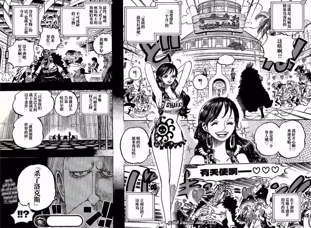 漫畫最新一話的標題是傳說的酒吧,這是指夏琪在蜂巢島開設酒館成為傳說的存在。扉頁小故事是小菊,大和等人拜祭跟凱多交戰而戰死的前輩,後面有凱多的雪人,這是烏爾緹堆積的雪人。