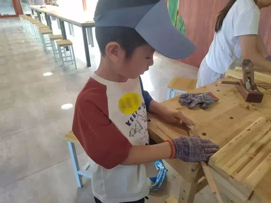 在自然材料區挑選適合的木材(松木/竹片),觀察年輪與紋理,用尺子測量尺寸,學習使用刨子打磨木材,砂紙由粗到細逐級打磨。