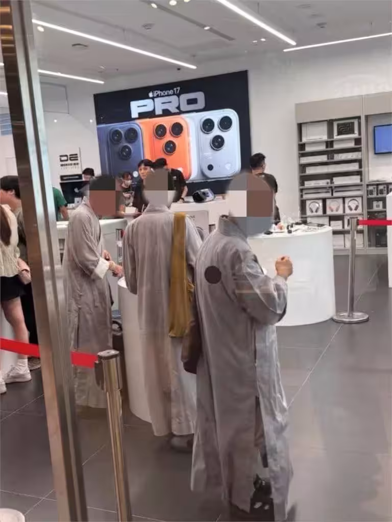 該名女網友在臉書「爆廢公社公開版」分享照片表示,當天在iPhone17販售現場看到「出家人」在店內參觀,照片中有三名出家人進店,似乎正在挑選新款iPhone 17,其中兩人低頭專注於櫃檯前,看起來正在認真比較機型。雖然僅拍到背影,無法得知他們選的是哪一款,但店內iPhone 17的廣告相當醒目,再加上現場人潮眾多,幾乎可確定是為蘋果新機而來,讓女網友開玩笑說「出家人也來跟我搶手機」。
