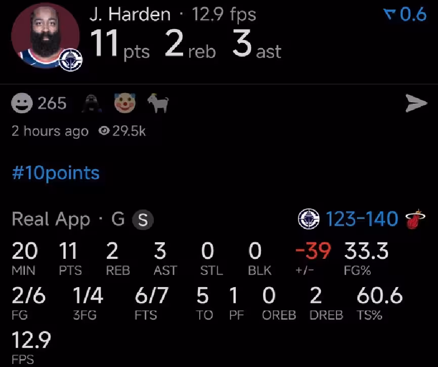 本賽季至今,快船以5勝16負西部倒數第二,哈登出戰了其中的20場比賽,場均上陣35.1分鐘,貢獻26.9分5.7板8.4助4.1失誤1斷,三項命中率43.5%、36.9%和90.6%。